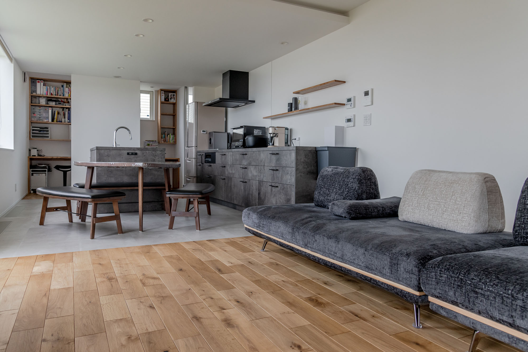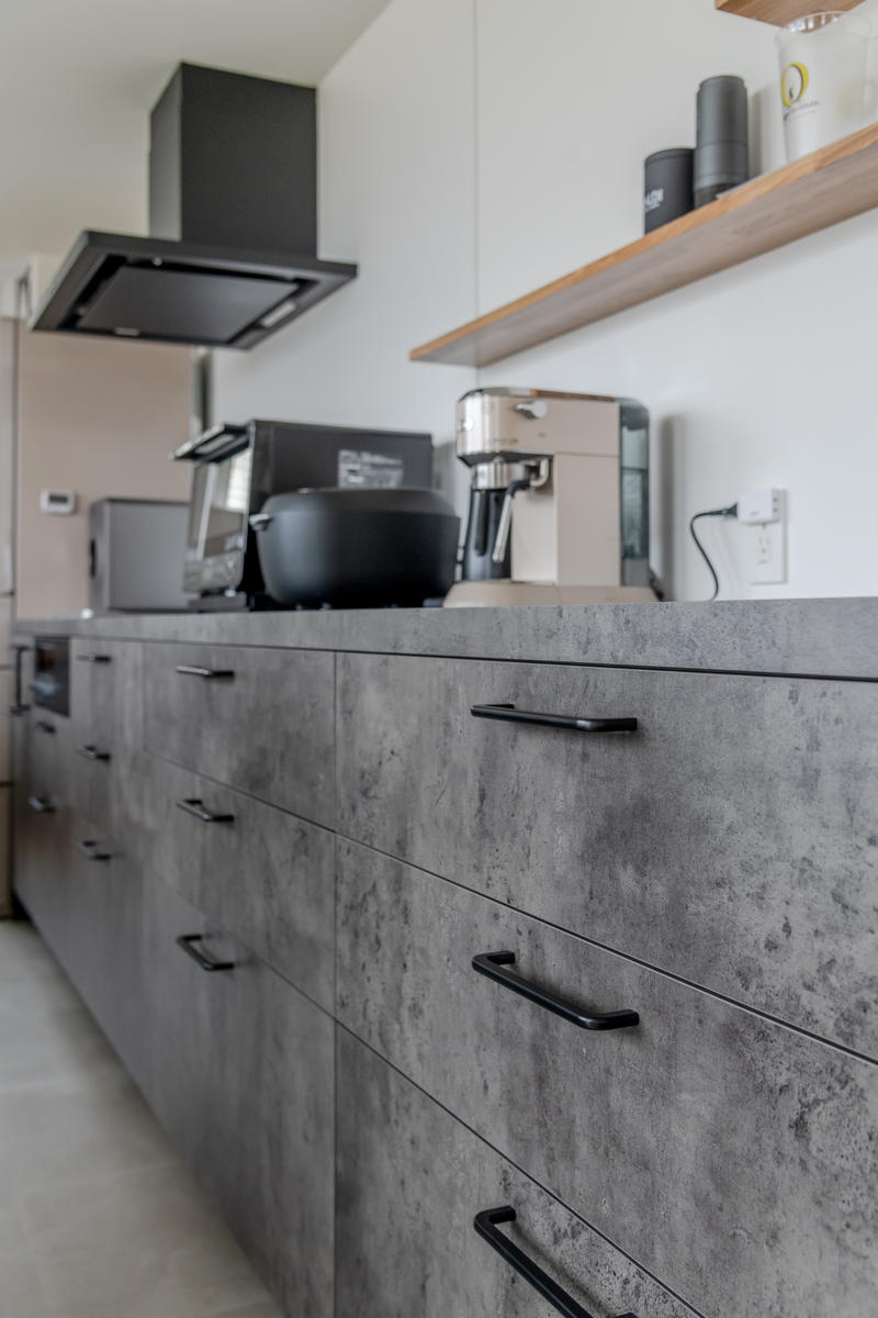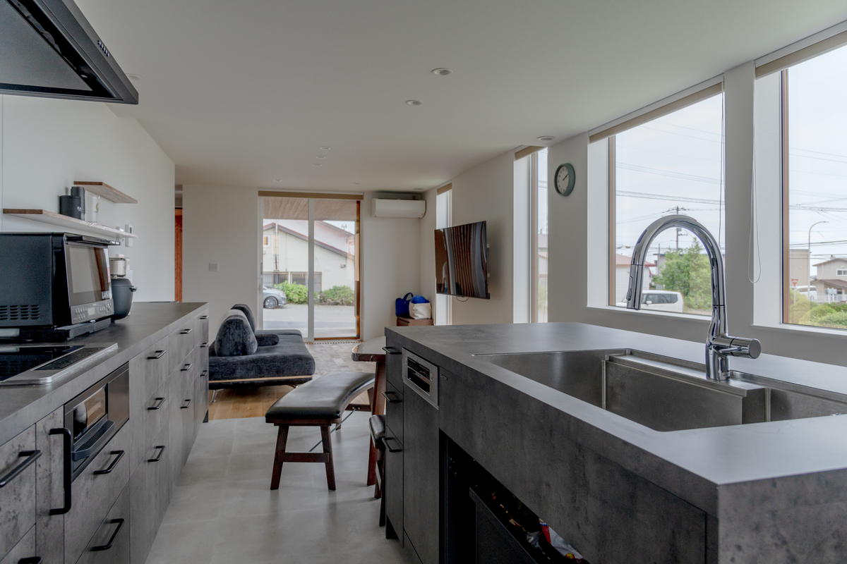 縦長のLDKの1番奥にキッチンハウスのオーダーキッチン「GRAFTEKT」があります。ダイニング側に向かってアイランドタイプのシンクを、壁側にIHコンロとカップボードを配置した「2列型」のレイアウトです。