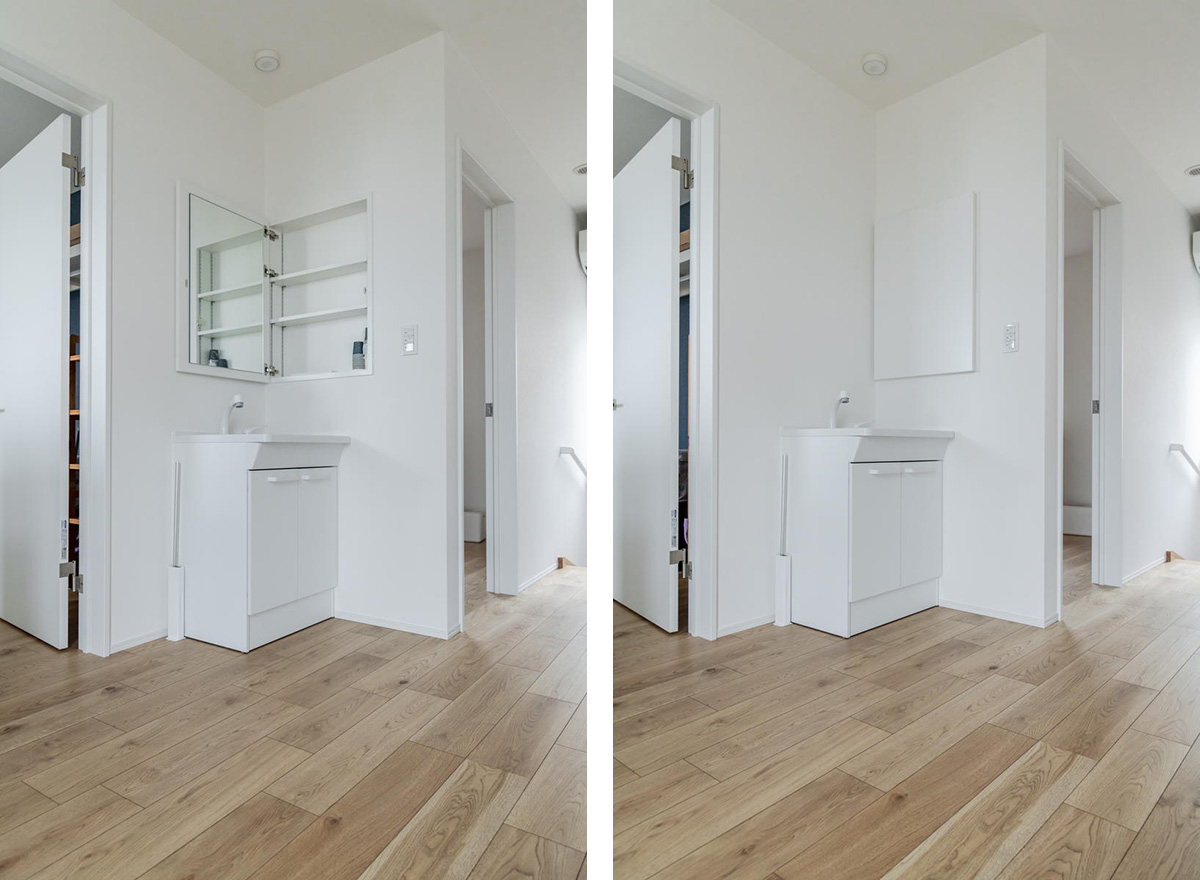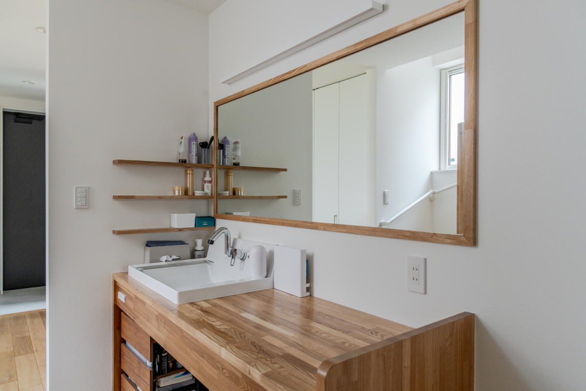 木製の造作洗面カウンターとミラーは渋谷建設の2024年モデルハウスのミニ洗面台を参考に、お子さんが並んで使えるワイドサイズにアレンジしました。