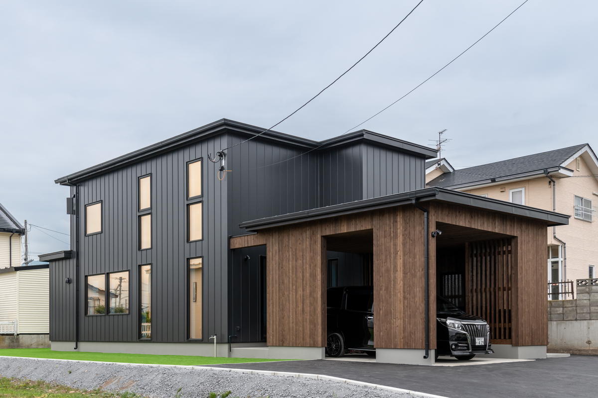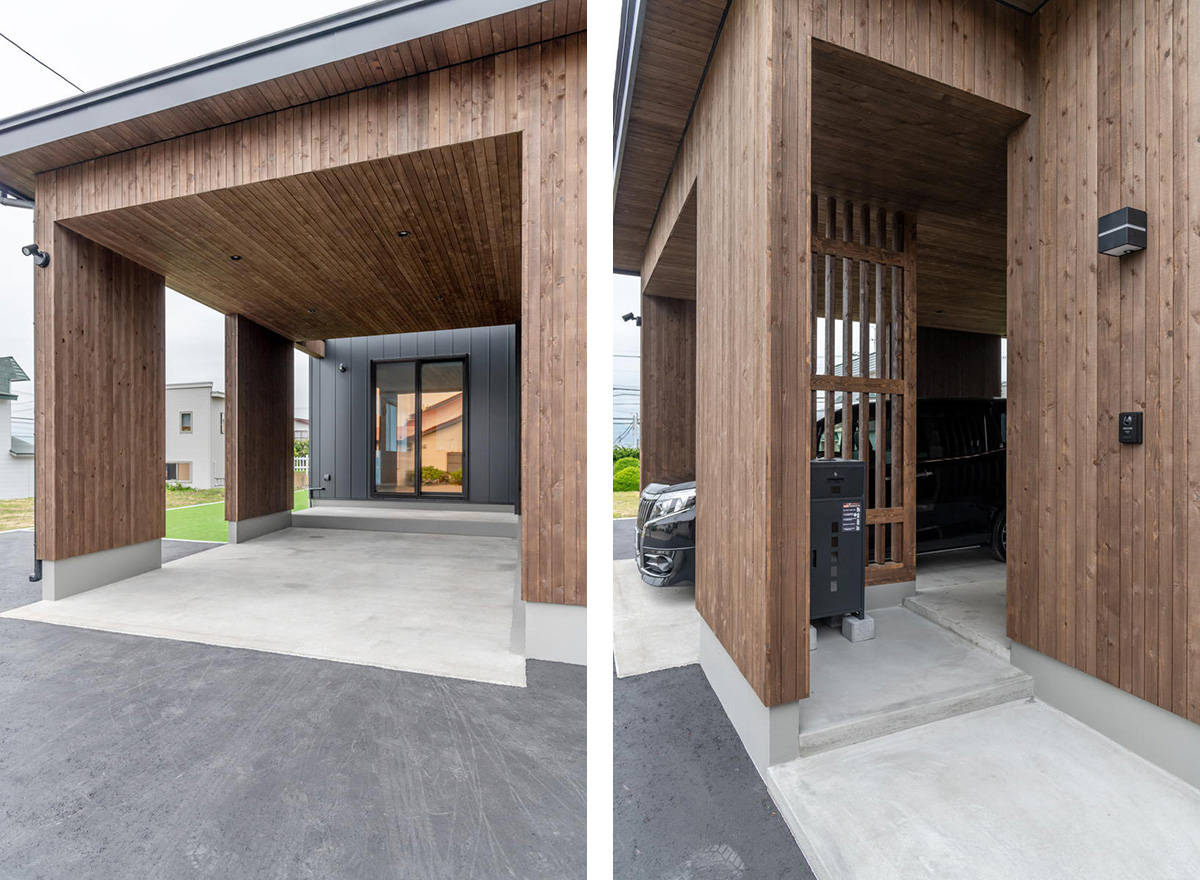 ダークグレーのガルバリウム鋼板の落ち着いた雰囲気の外観。ビルトインカーポート(左)とエントランス(右)には高級感のある道南杉が使われています。