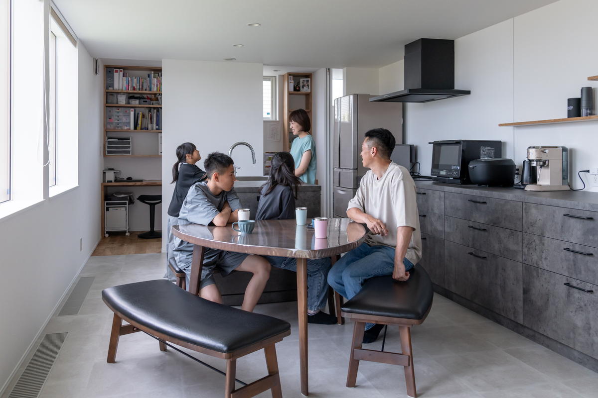 ダイニングテーブルは配膳と後片付けがしやすいシンクの横に配置。テーブルの周りに自然と家族の輪ができます。