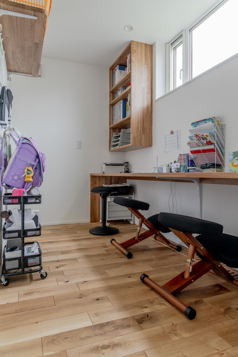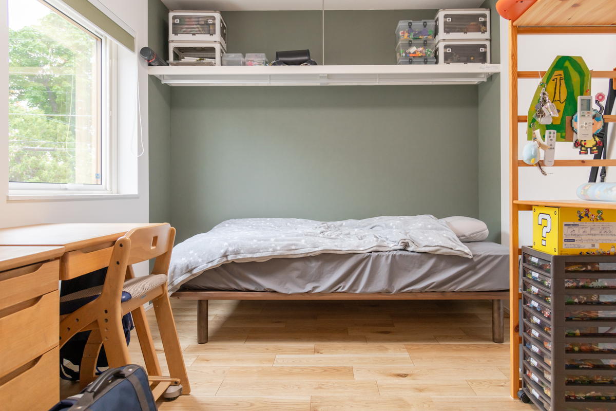 1階に家族全員で使えるウォークインクローゼットがあるので子ども部屋には大きな収納をつけませんでした。代わりにプラスチックの収納ケースが置ける棚を取り付け、天井近くの空間を有効に使っています。