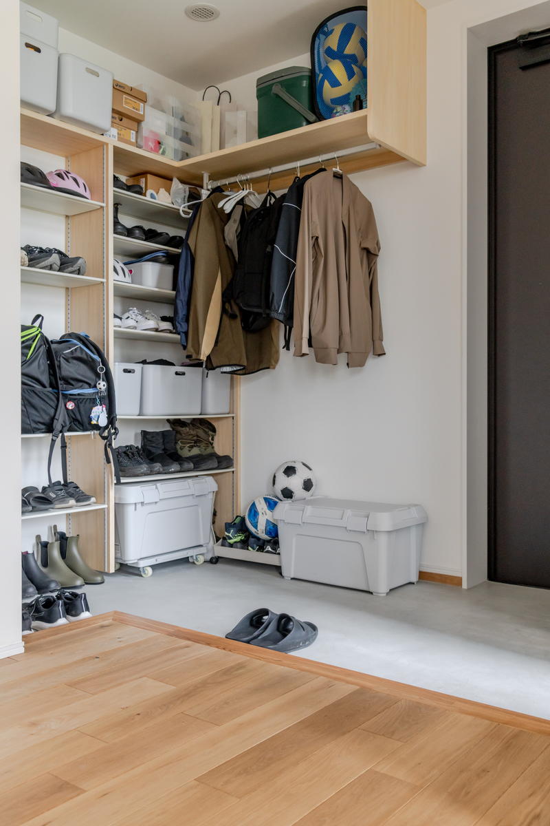 LDKと一体化した玄関ホールにはお子さんのために高さが調節できるオープンなシューズクロークを設置しています。