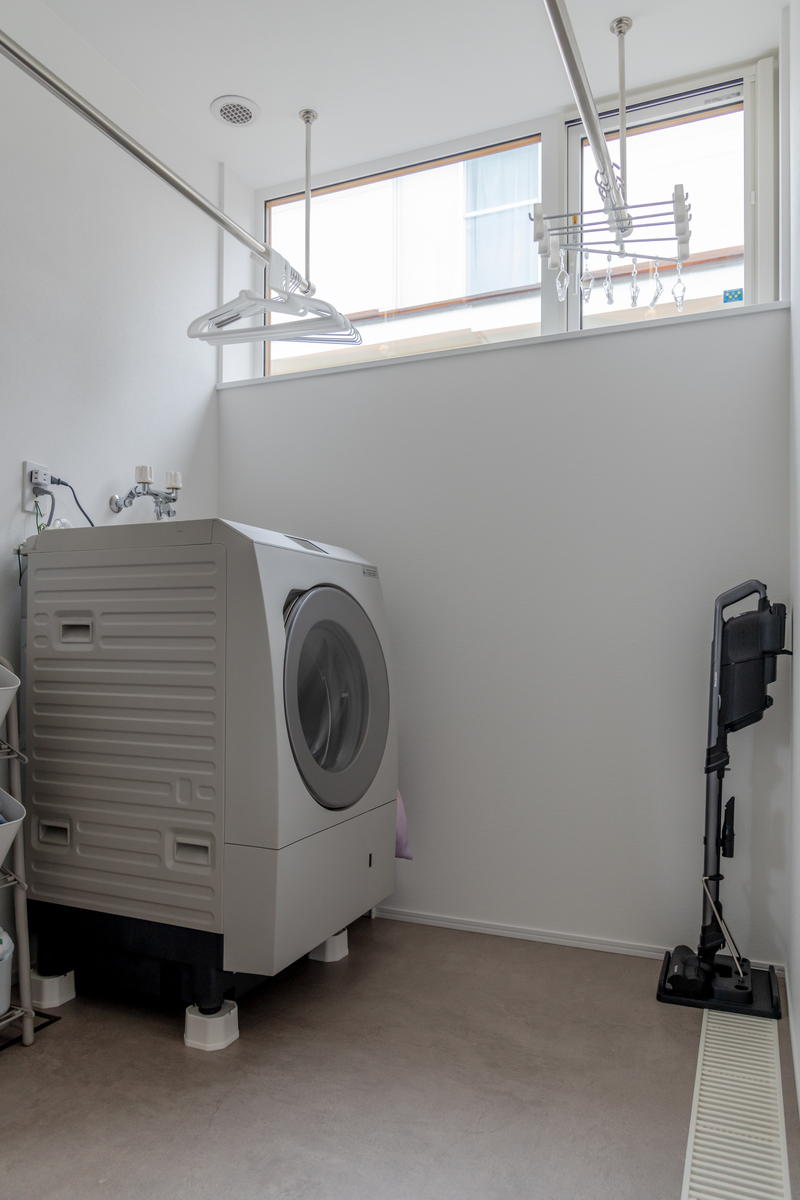 新築時に購入したドラム式洗濯機が置かれたランドリー。脱衣室と洗面スペースの中間に位置し、どちらへも行き来がスムーズです。