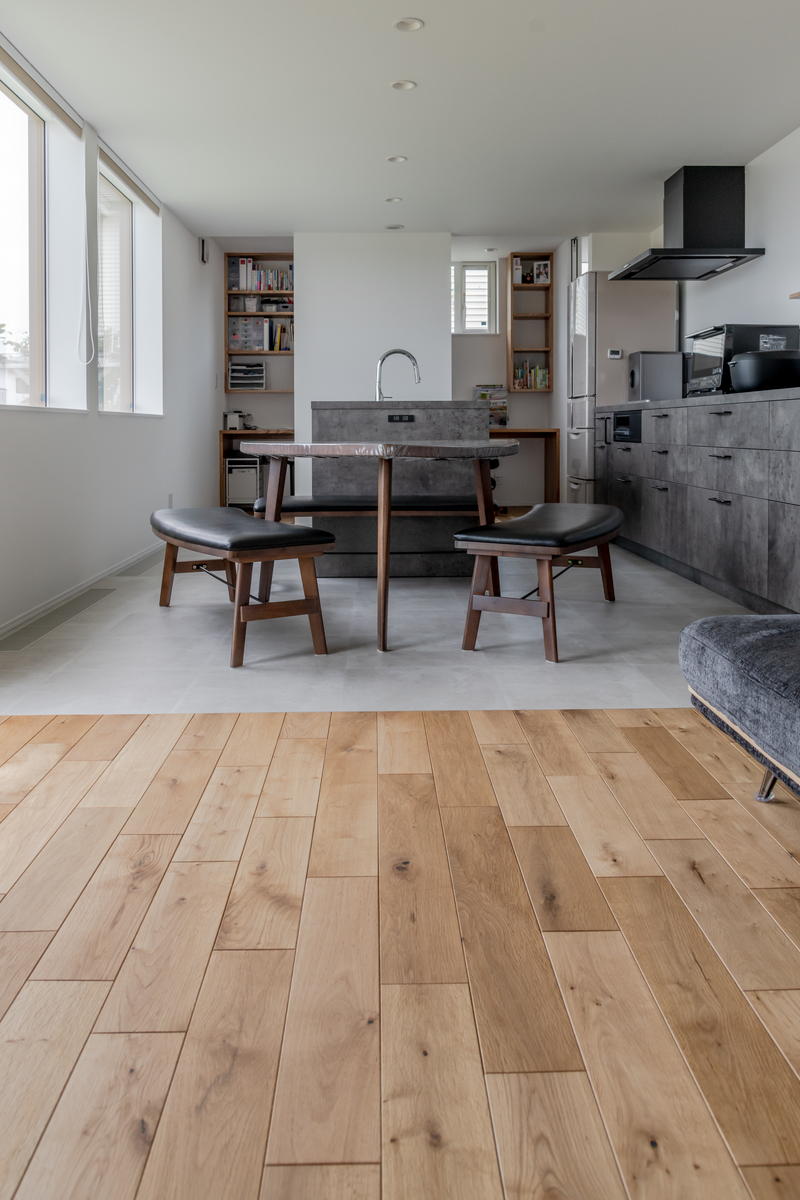 奥さま 「モデルハウスみたいにして下さい」とお願いしました。リビングとダイニングの床の素材を変えたのもモデルハウスをお手本にしています。