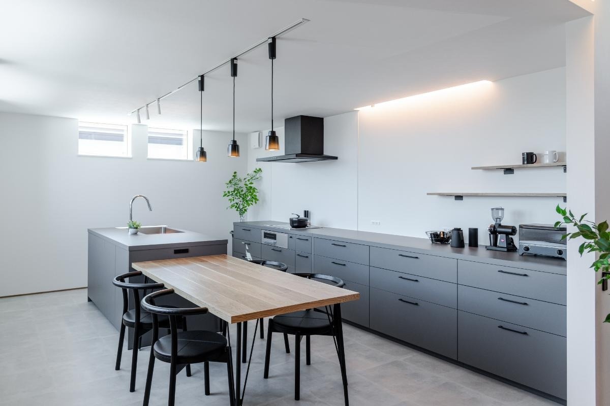 LDKは2階に配置。キッチンハウスのオーダーキッチンを軸に、高窓、魅せる収納、照明、巾木など細部に渡るデザインに配慮しています。